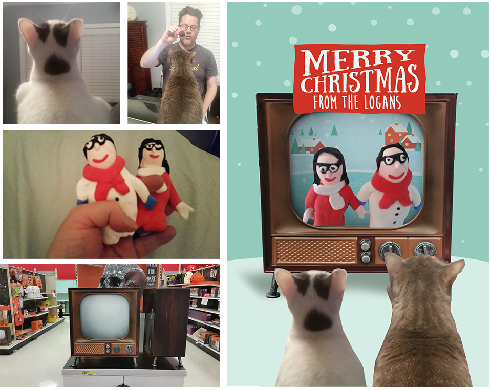 This holiday card was inspired by classic claymation. I hand-sculpted figures of my wife and me, carefully photographed our cats, and discovered a vintage TV at the grocery store. I brought everything together in Illustrator and Photoshop to complete the scene. You can see my full creative process displayed to the left.